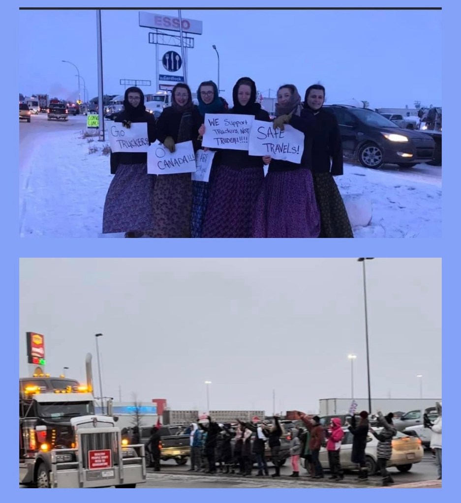 Hutterite women show happy encouragement in Saskatchewan and others line the highway greeting truckers.