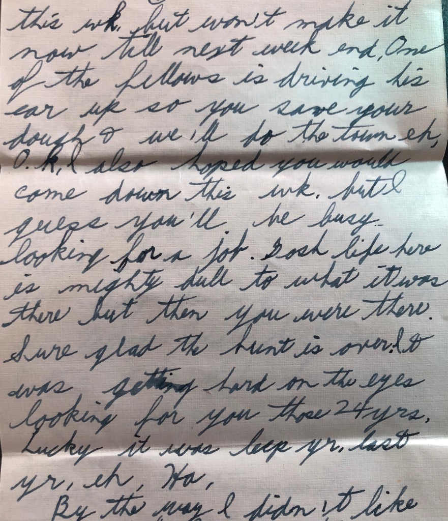 I now have in my dresser drawer the bundle of love letters my parents exchanged during the first months when they lived four hours apart. In one he wrote, “I’m sure glad the search is over. It was getting hard on the eyes hunting for you for twenty-four years.” Mom, less the romantic – someone had to be practical – had written in her beautiful script about getting her hair chopped off much too short. He addressed his next few letters to ‘Chop-chop’. Known for his wry humour my dad wanted always to give someone else a smile, though he kept a straight face before and after.