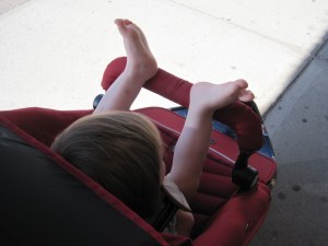 After I fed my dolly a cup of strawberry ice cream for her lunch, I figured we should make our way back to the car. There I was in front of my ride trying like mad to undo that child-proof four-point clip and thankful that grandpappy and I had never tightened the darn harness, as it was becoming clear that if we would have succeeded I’d have had to abandon my vehicle and stroller stuck-baby many miles back ‘home’ – instead I was taking off her shoes and preparing to lift and slide her out of the bottom harness when who should rescue us? Kindly grandfather-man, probably wondering why I hadn’t paid closer attention last time.